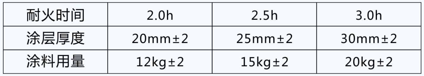 五、耐火時(shí)間和涂層厚度及涂料用量參考下表∶耐火時(shí)間3.0h,涂層厚度:7.0mm±0.2,涂料用量:7kg±0.2